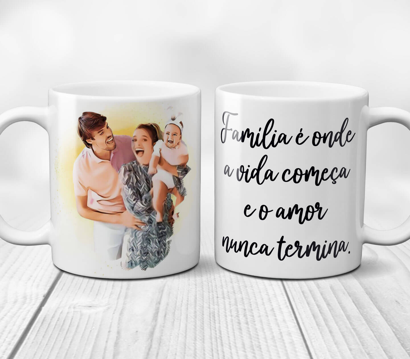 Canecas de porcelana branca com 350ml e 10cm de altura. Consulte valores para outras cores de interior e alça da caneca.