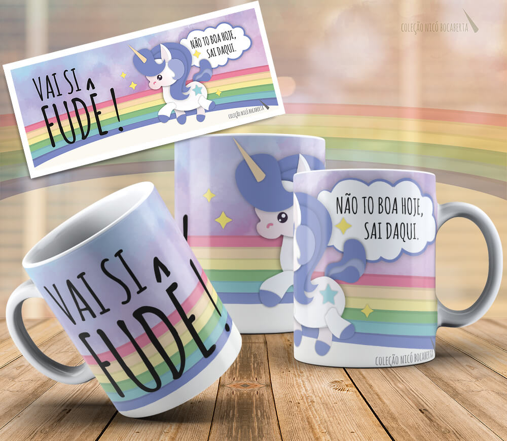 Canecas dos Unicórnios, Nicó Bocaberta, (Vai si fudê – Não to boa hoje, sai daqui.) É possível personalizar com outras frases, me chama no Whatsapp pra gente combinar.