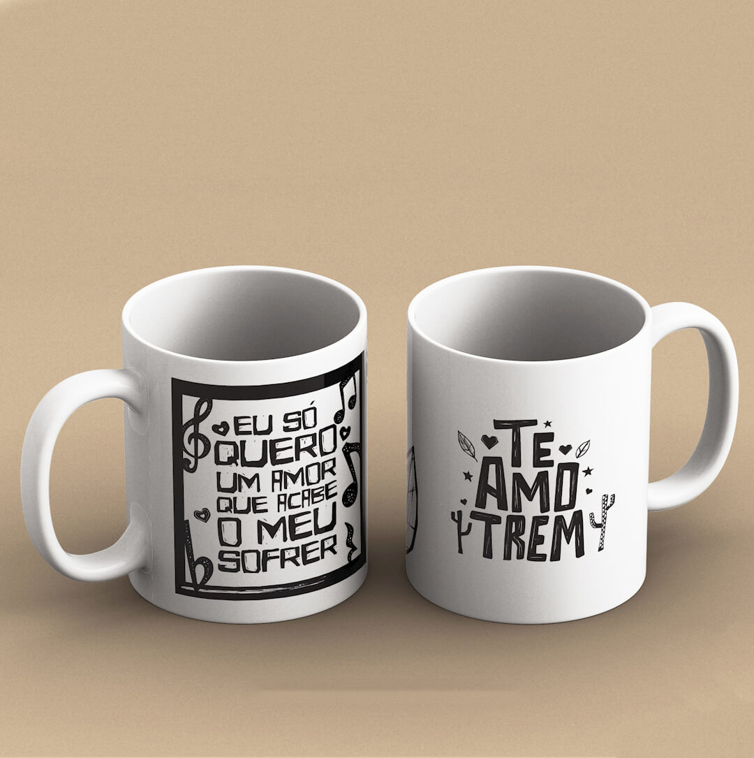 Canecas de porcelana com 350ml e 10cm de altura.