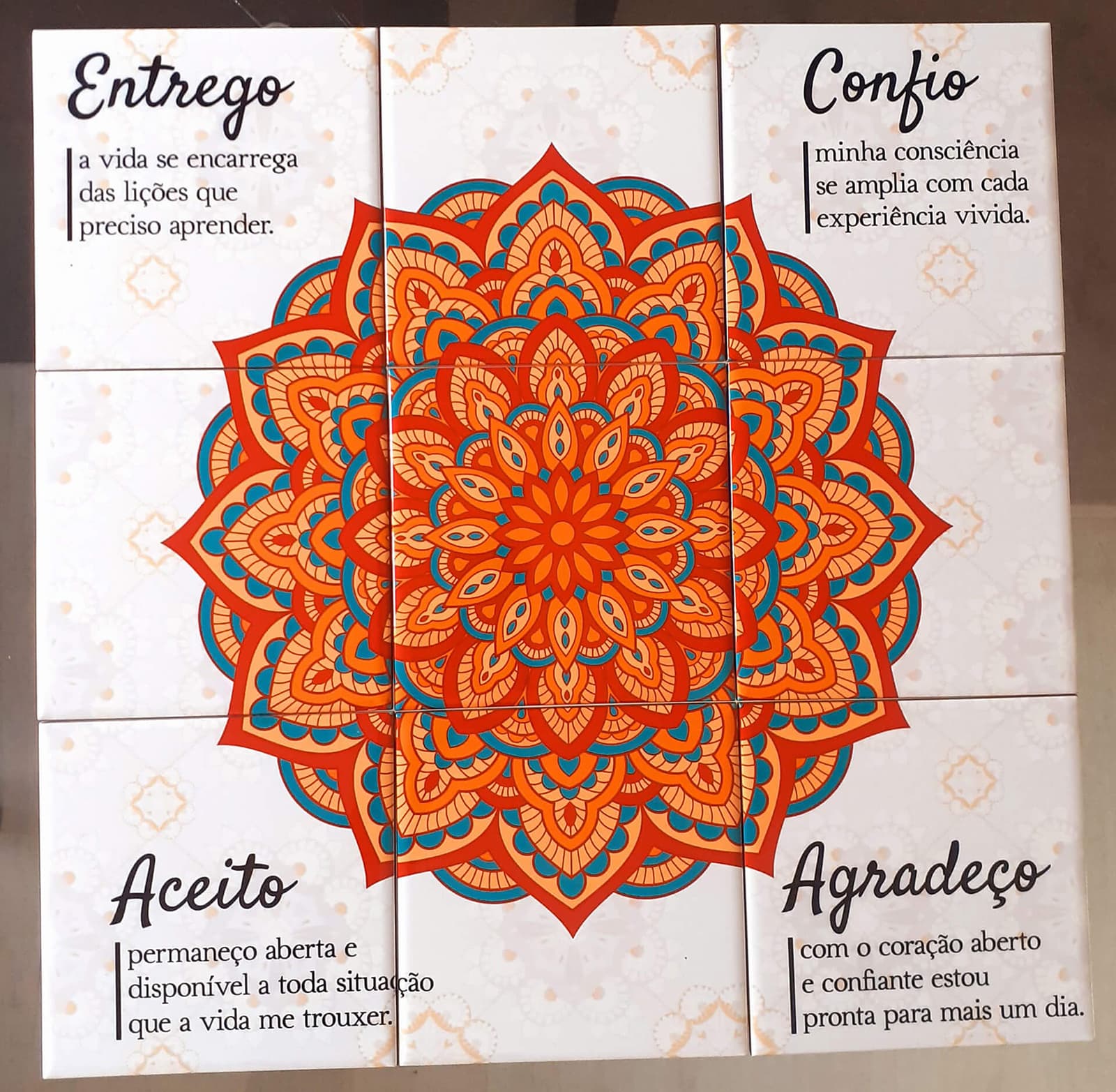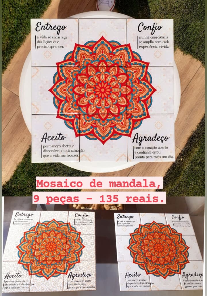 Mosaico de Azulejos composto por 9 peças com fita 3M no verso para grudar em paredes lisas. Cada azulejo mede 15cm, o tamanho total dessa peça fica 45x45cm. Se precisar de outros tamanhos ou formatos é só entrar em contato.